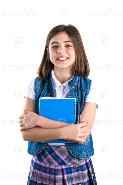Красивая девушка в школьной форме с блокнотом в руке на белом фоне