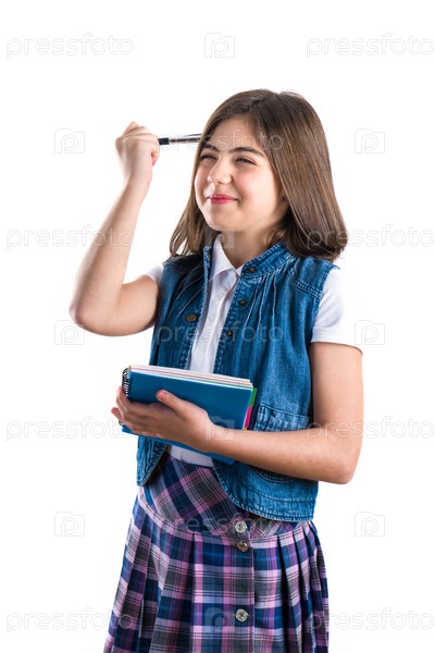 Красивая девушка в школьной форме с блокнотом в руке на белом фоне