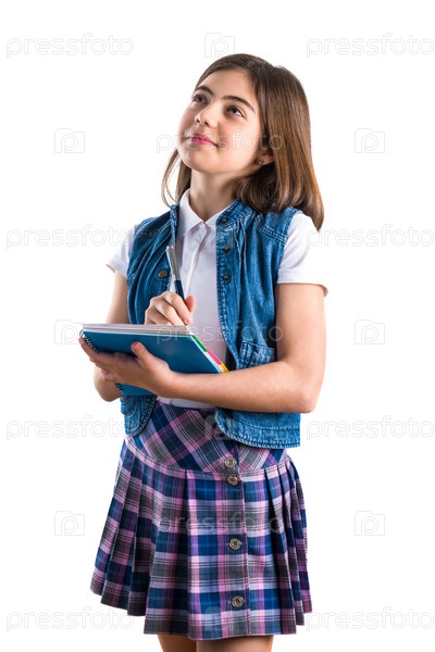 Красивая девушка в школьной форме с блокнотом в руке на белом фоне