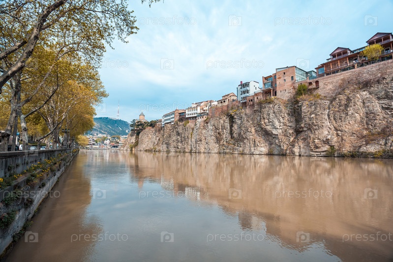 Церковь Метехи и дома на краю обрыва над рекой Кура. Тбилиси, исторический центр города