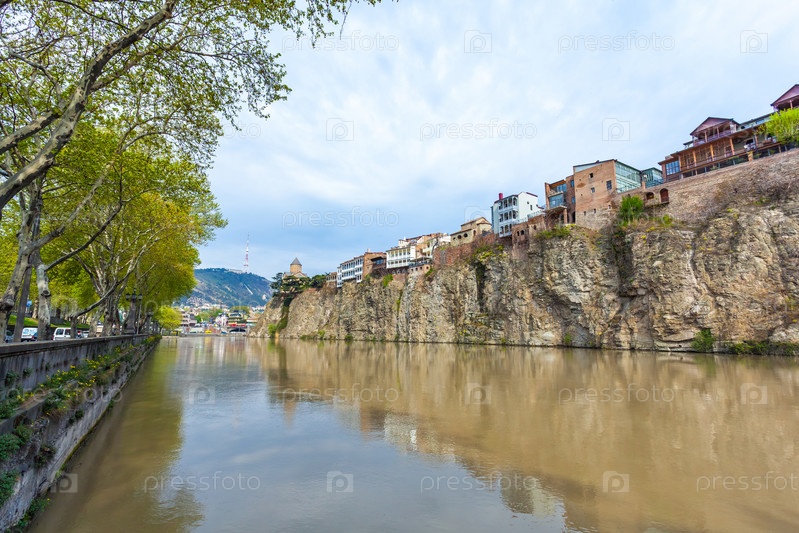 Церковь Метехи и дома на краю обрыва над рекой Кура. Тбилиси, исторический центр города