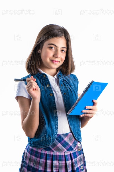 Красивая девушка в школьной форме с блокнотом в руке на белом фоне