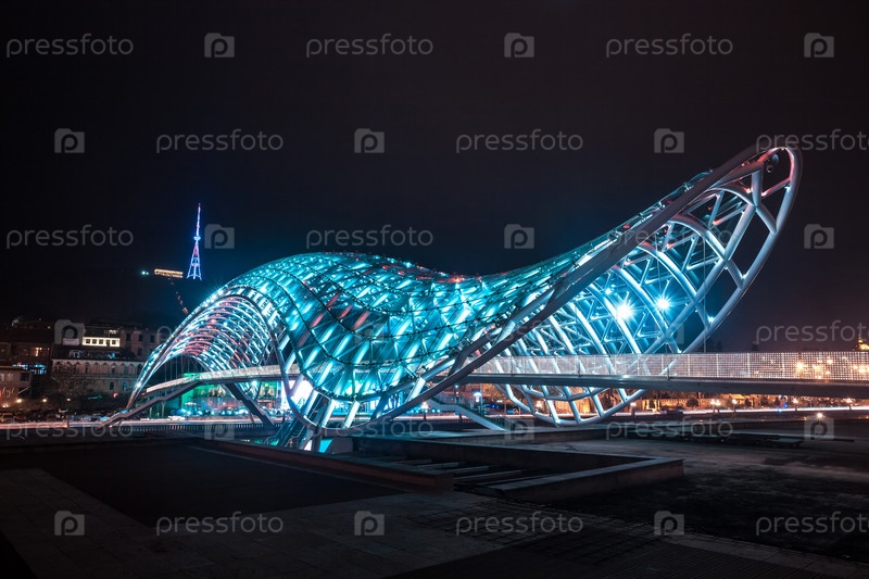 Пешеходный мост мира через реку Мтквари (Кура) в Тбилиси ночью