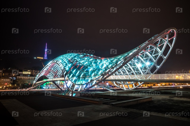 Пешеходный мост мира через реку Мтквари (Кура) в Тбилиси ночью
