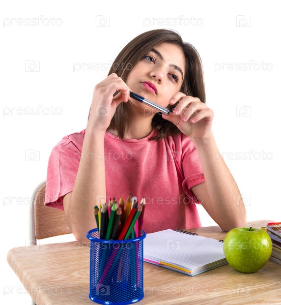 Красивая школьница сидит за столом с яблоком