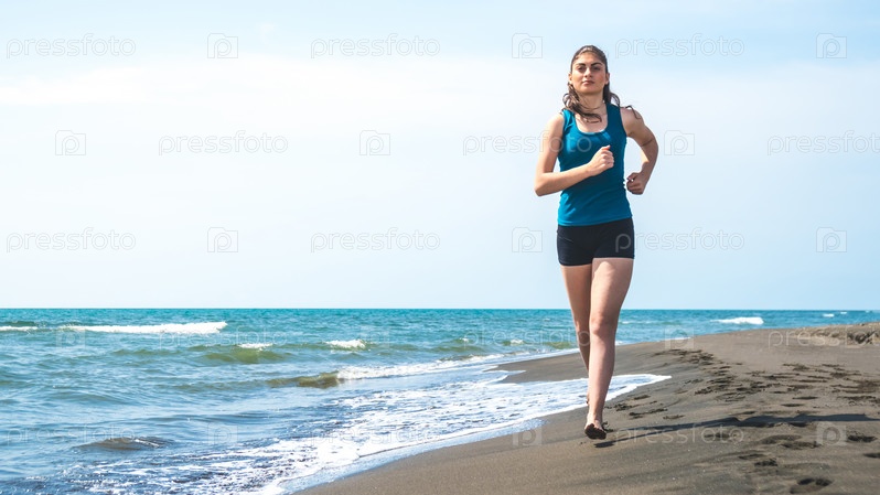 Красивая спортивная девушка бежит вдоль красивого песчаного пляжа