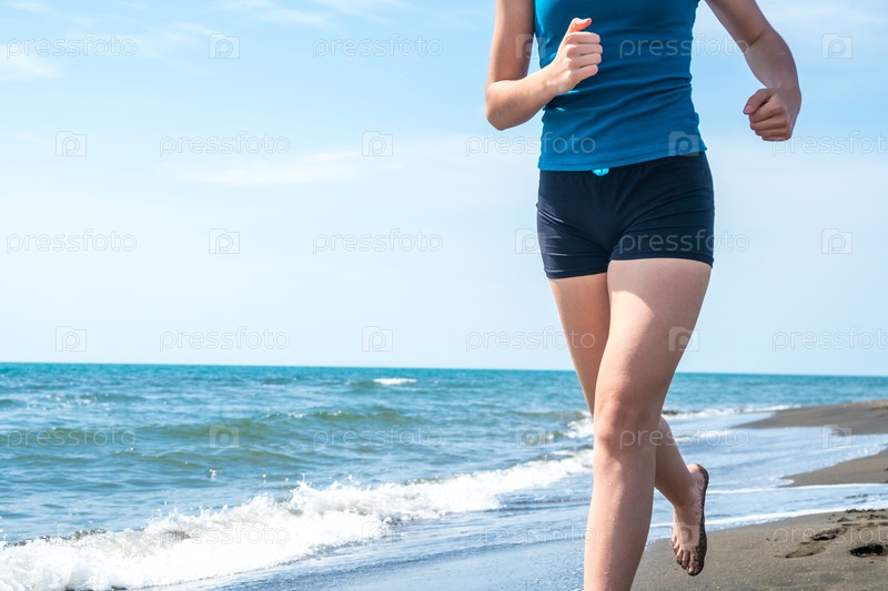 Красивая спортивная девушка бежит вдоль красивого песчаного пляжа