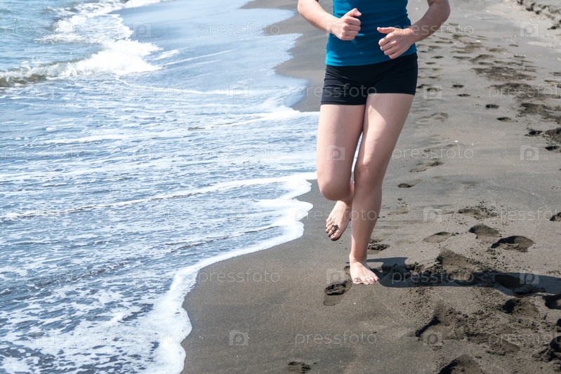 Красивая спортивная девушка бежит вдоль красивого песчаного пляжа
