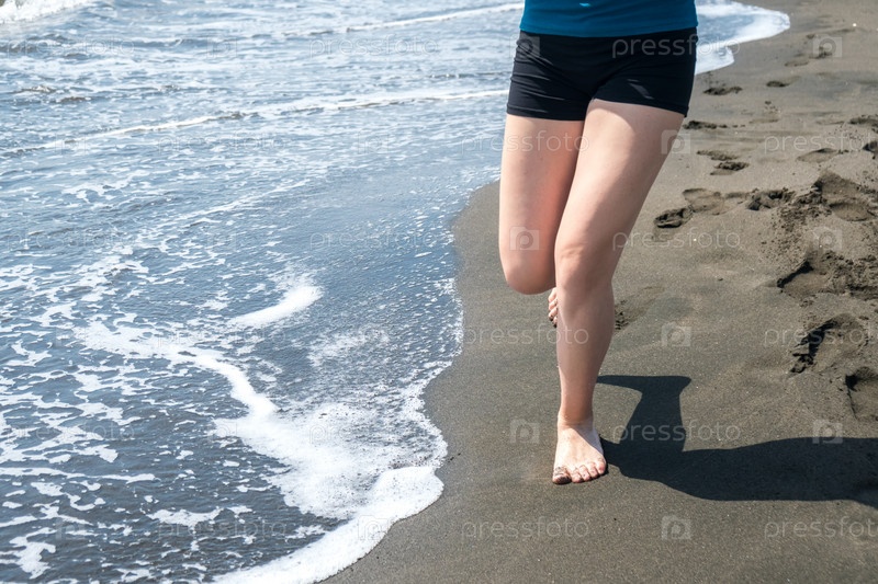 Красивая спортивная девушка бежит вдоль красивого песчаного пляжа