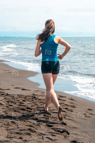 Красивая спортивная девушка бежит вдоль красивого песчаного пляжа