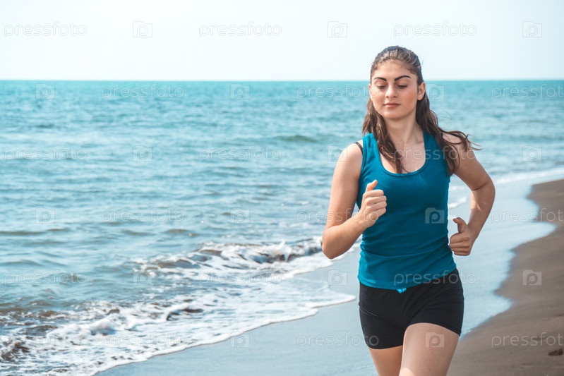 Красивая спортивная девушка бежит вдоль красивого песчаного пляжа