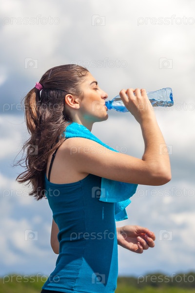 Прекрасная спортивная девушка пьет воду