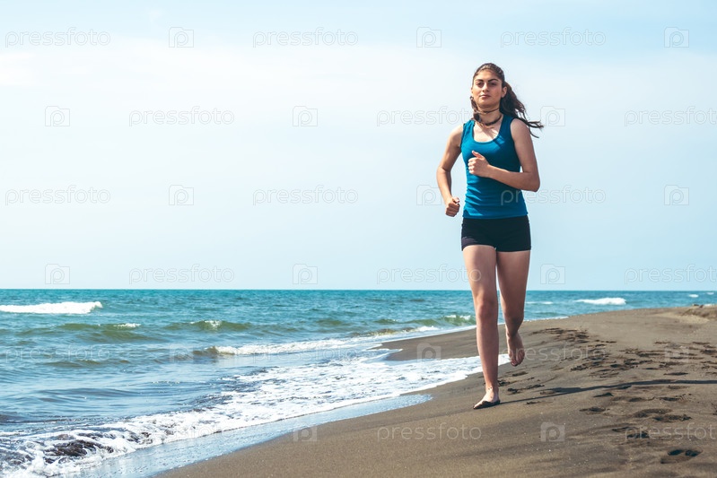 Красивая спортивная девушка бежит вдоль красивого песчаного пляжа