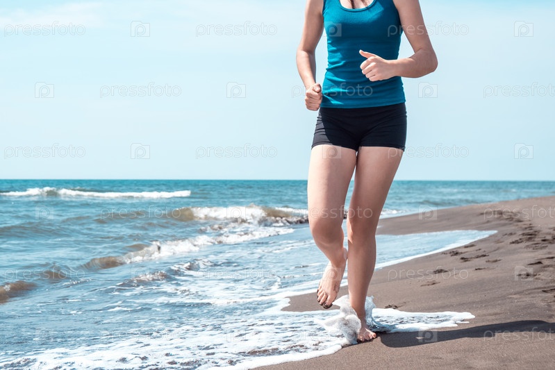 Красивая спортивная девушка бежит вдоль красивого песчаного пляжа