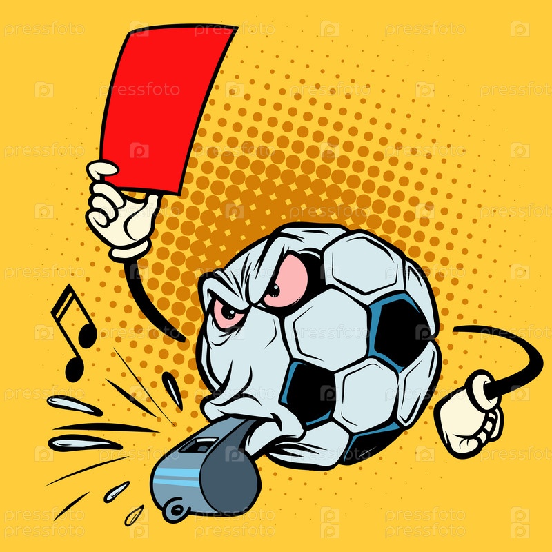 Красная карточка, свисток судьи. Футбольный мяч для футбола. Забавный персонаж