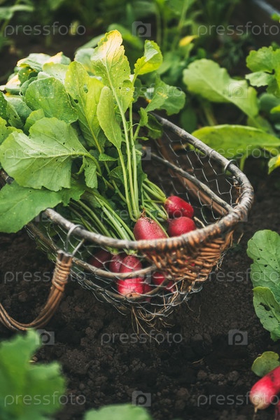 Свежие красные редисы с листьями в корзине