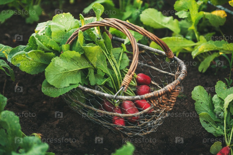 Свежие красные редисы с листьями в корзине
