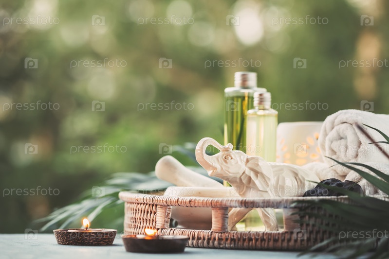 Красивая композиция с натуральной косметикой, полотенцами и горящими свечами