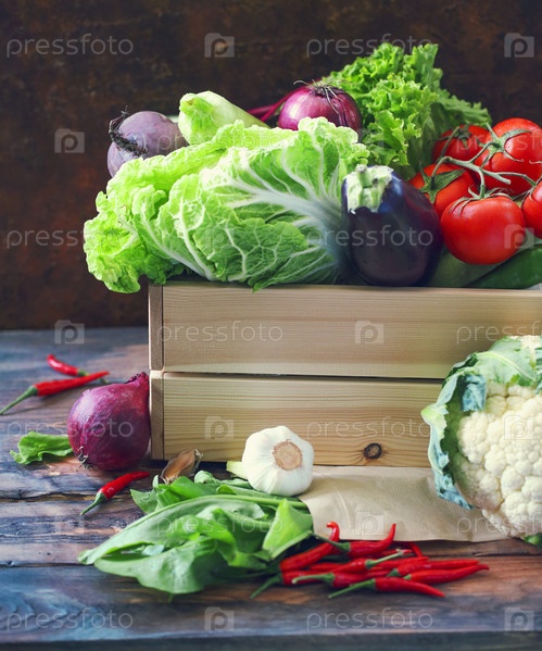 Органические сырые овощи в деревянной коробке.Здоровая диета и концепция питания