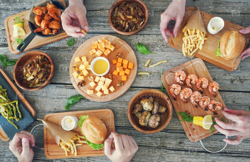 Вид сверху на стол с едой и закусками