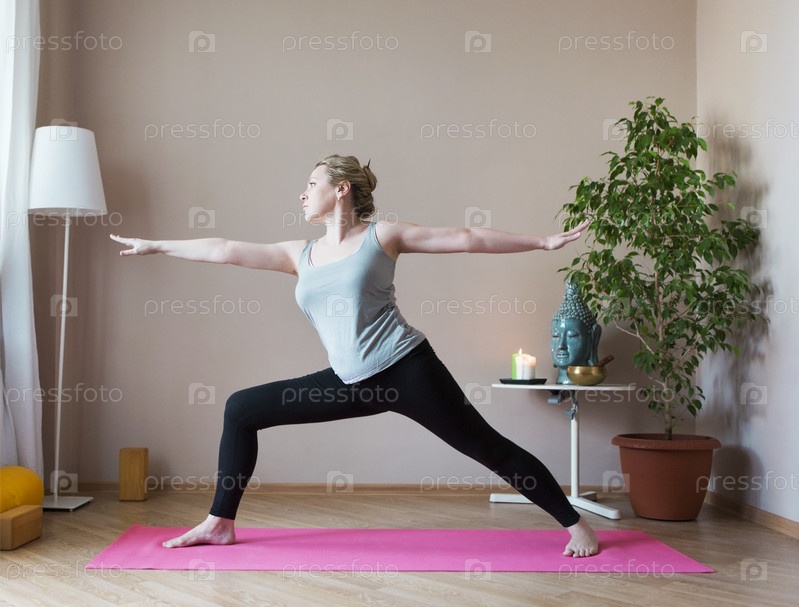 Женщина средних лет занимается йогой в помещении