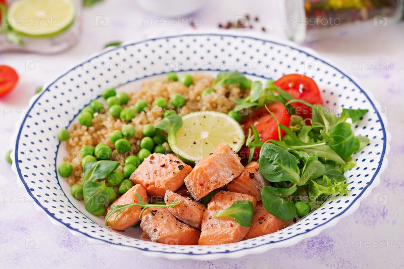 Здоровый ужин.Листки жареного лосося, киноа, зелёного гороха, томата, лайма и листья салата