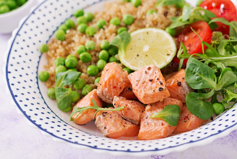 Здоровый ужин.Листки жареного лосося, киноа, зелёного гороха, томата, лайма и листья салата