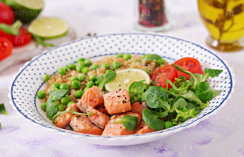 Здоровый ужин.Листки жареного лосося, киноа, зелёного гороха, томата, лайма и листья салата