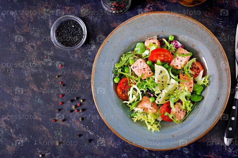 Здоровый салат с рыбой. Выпеченный лосось, помидоры, лайм и салата. Здоровый ужин. Плоская кровать. Вид сверху