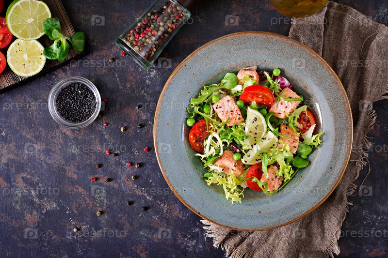 Здоровый салат с рыбой. Выпеченный лосось, помидоры, лайм и салата. Здоровый ужин. Плоская кровать. Вид сверху