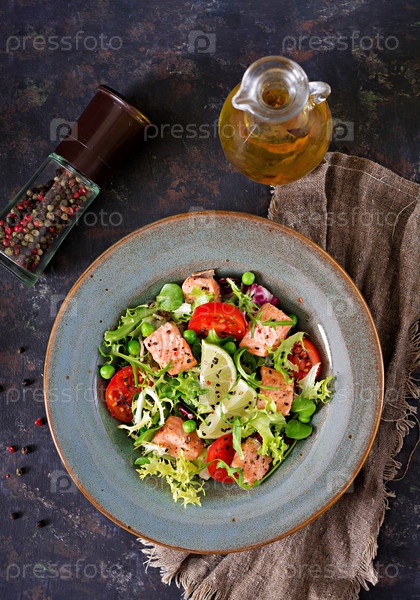 Здоровый салат с рыбой. Выпеченный лосось, помидоры, лайм и салата. Здоровый ужин. Плоская кровать. Вид сверху