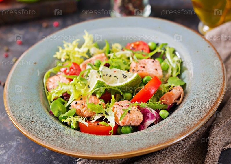 Здоровый салат с рыбой, запеченный лосось, помидоры, лайм и салата