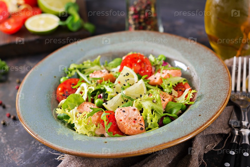 Здоровый салат с рыбой, запеченный лосось, помидоры, лайм и салата