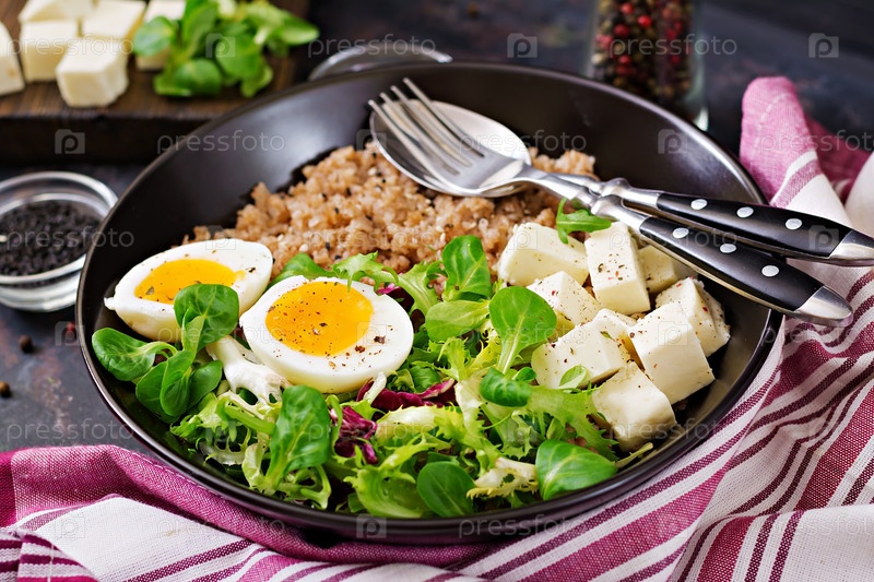 Здоровый завтрак с яйцами, сыром, салата и гречневой кашей на темном фоне. правильное питание