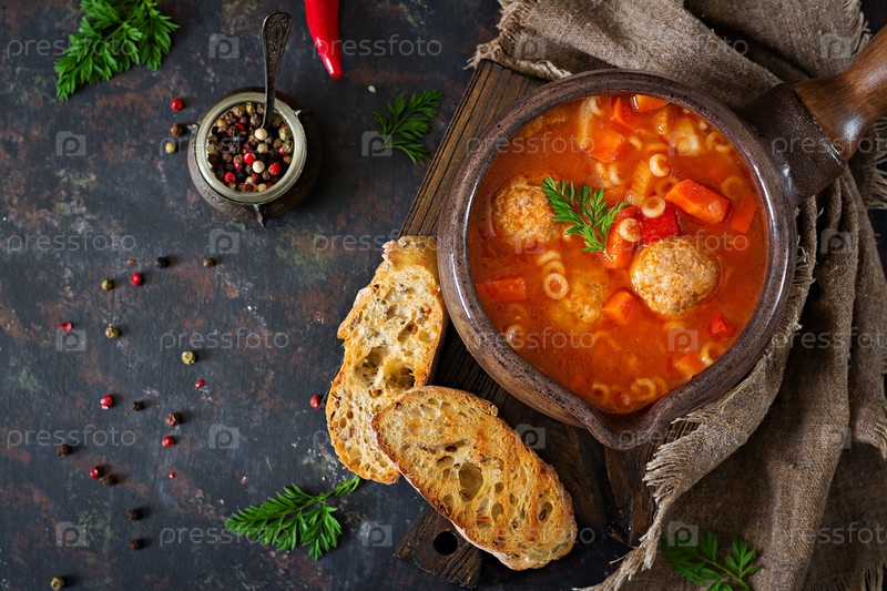 Пикантный томатный суп с фрикадельками, макаронами и овощами.Здоровый ужин.Вид сверху
