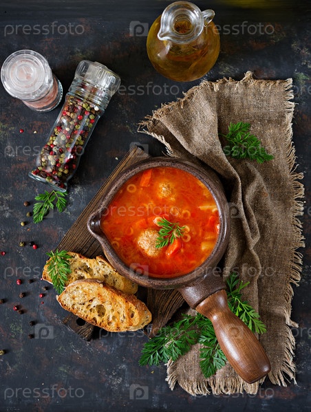 Пикантный томатный суп с фрикадельками, макаронами и овощами.Здоровый ужин.Вид сверху