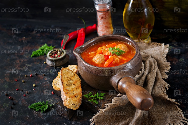 Пикантный томатный суп с фрикадельками, макаронами и овощами.Здоровый ужин