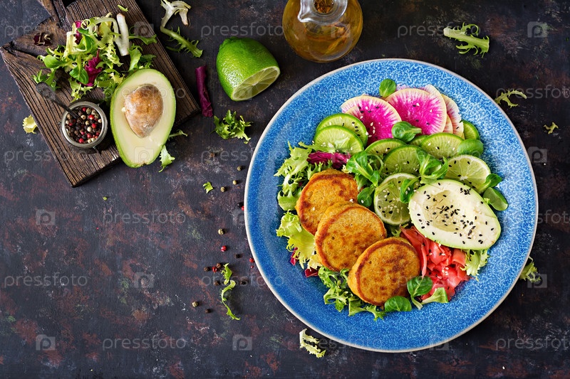 Веганская чаша Будды обеденный стол. Здоровая еда. Здоровая вегетарианская ланч-купа. Фритер с чечевицей и редисом, салат авокадо. Плоский слой. Вид сверху