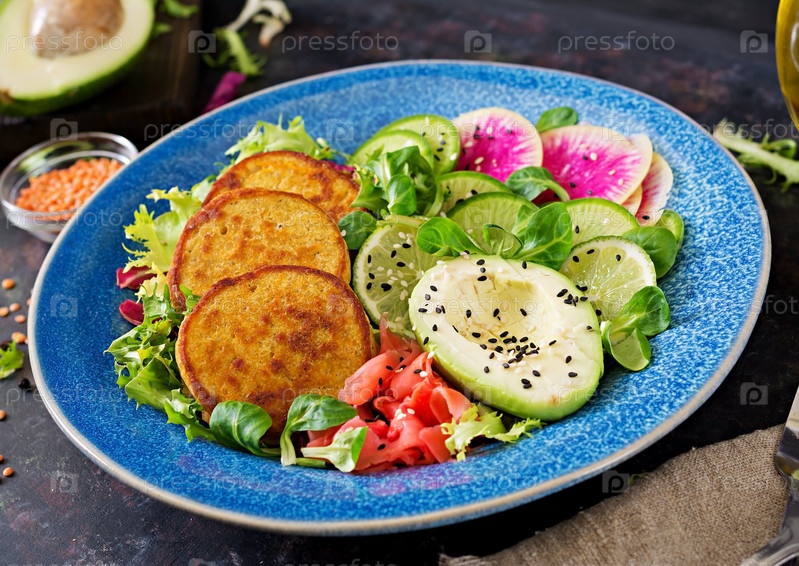 Веганская чаша Будды обеденный стол. Здоровая еда. Здоровая вегетарианская ланч-купа. Фриттер с чечевицей и редисом, салат авокадо