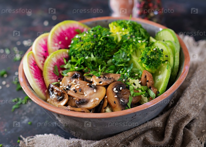 Веганская чаша Будды обеденный стол. Здоровая еда. Здоровая вегетарианская ланч-купа. Жареные грибы, брокколи, салат из редиса