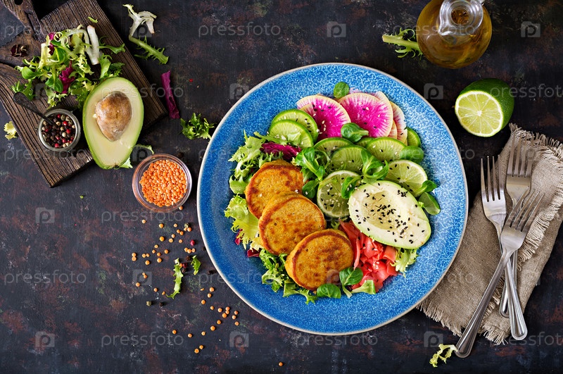 Веганская чаша Будды обеденный стол. Здоровая еда. Здоровая вегетарианская ланч-купа. Фритер с чечевицей и редисом, салат авокадо. Плоский слой. Вид сверху