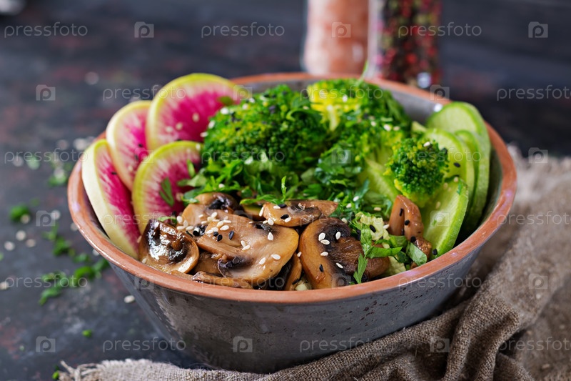 Веганская чаша Будды обеденный стол. Здоровая еда. Здоровая вегетарианская ланч-купа. Жареные грибы, брокколи, салат из редиса