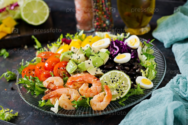 Здоровая салатная тарелка. Свежий рецепт морепродуктов. Жареные креветки и свежий овощный салат - авокадо, помидор, черные бобы, красную капусту и паприку. Жареный креветок. Здоровая еда