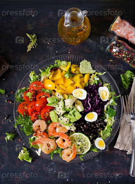 Здоровая салатная тарелка. Свежий рецепт морепродуктов. Жареные креветки и свежий овощный салат - авокадо, помидор, черные бобы, красная капуста и паприка. Горячие креветы. Здоровая еда. Плоская ложка. Вид сверху