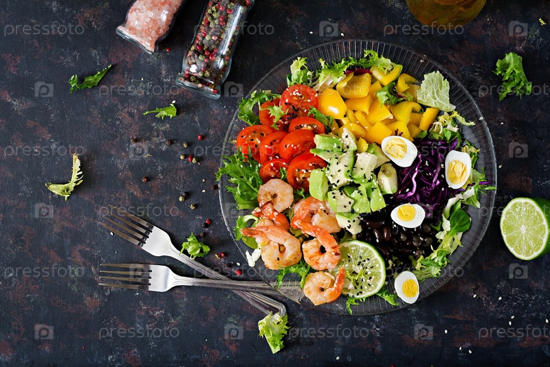 Здоровая салатная тарелка. Свежий рецепт морепродуктов. Жареные креветки и свежий овощный салат - авокадо, помидор, черные бобы, красная капуста и паприка. Горячие креветы. Здоровая еда. Плоская ложка. Вид сверху