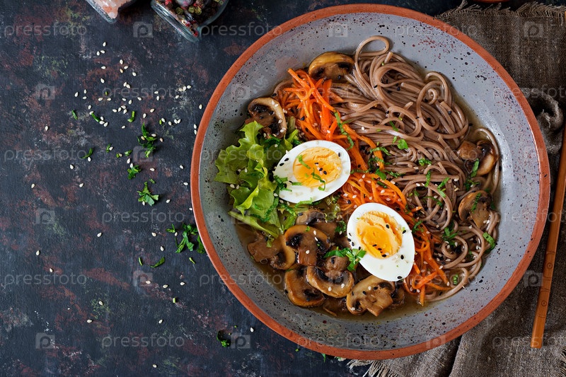 Японская рамен-мисо лапша с яйцами, морковью и грибами. суп вкусная еда. плоский слой. вид сверху
