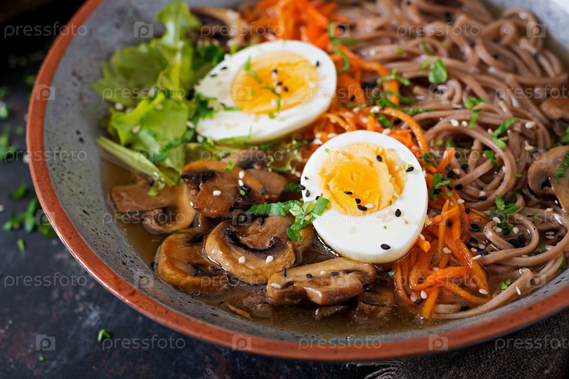 Японские лапши рамен-мисо с яйцами, морковью и грибами