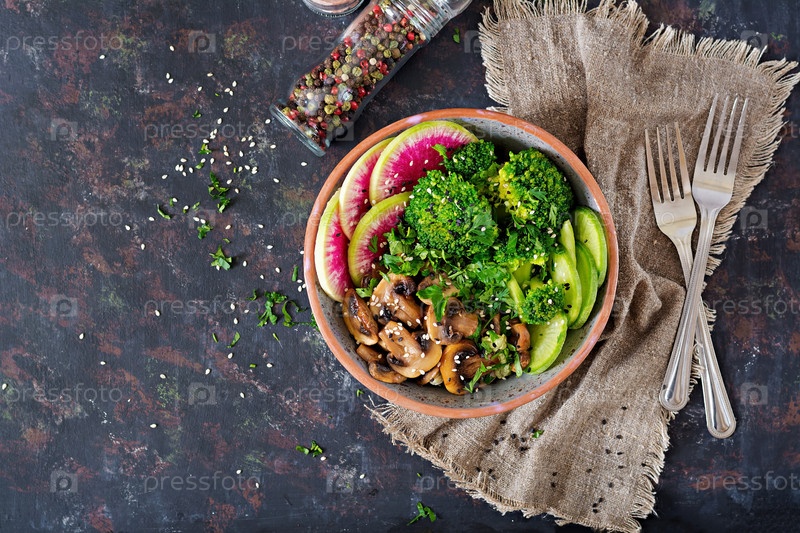 Веганская чаша Будды обеденный стол. Здоровая еда. Здоровая вегетарианская ланч-купа. Жареные грибы, брокколи, салат из редиса. Плоский слой. Вид сверху