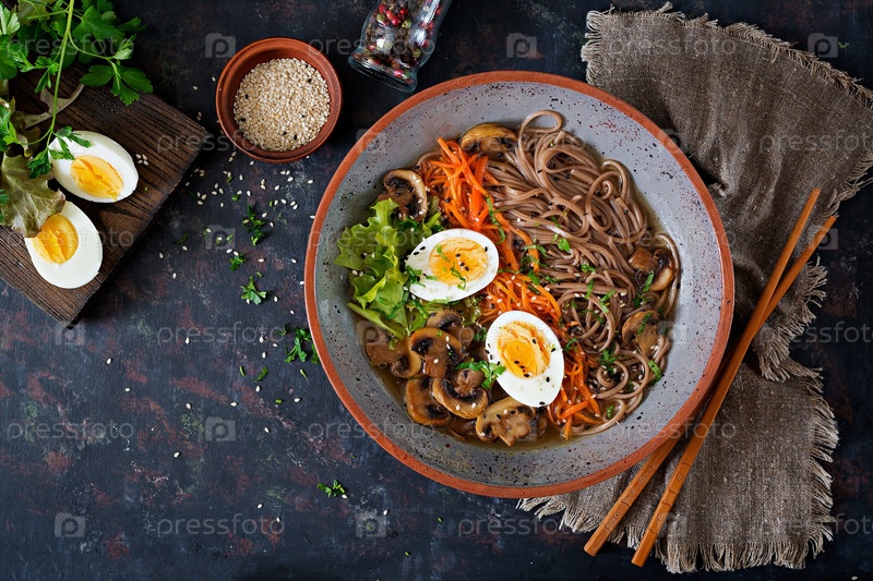 Японская рамен-мисо лапша с яйцами, морковью и грибами. суп вкусная еда. плоский слой. вид сверху
