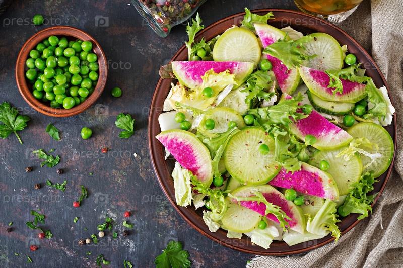 Салат из редиса, огурцов и листьев салата. Веганская еда. Диетическое меню. Вид сверху. Плоский слой